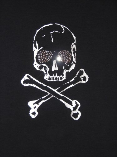 T-krekls ar likru, M izmērs, tumši zilā krāsā ar sudraba skeletgalvu un kristāliem, ir nopērkams! Var piedrukāt tekstu. -
